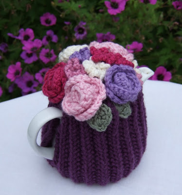 I always drink herbal tea from a bone china cup or mug because I think it tastes better! My favourites are a very old cup and saucer which belonged to my grandmother - and a newer mug - all of which are decorated with violets. So I thought it would be fitting to make the tea cosy in a deep shade of purple with lilac, pink and white flowers decorating the top.